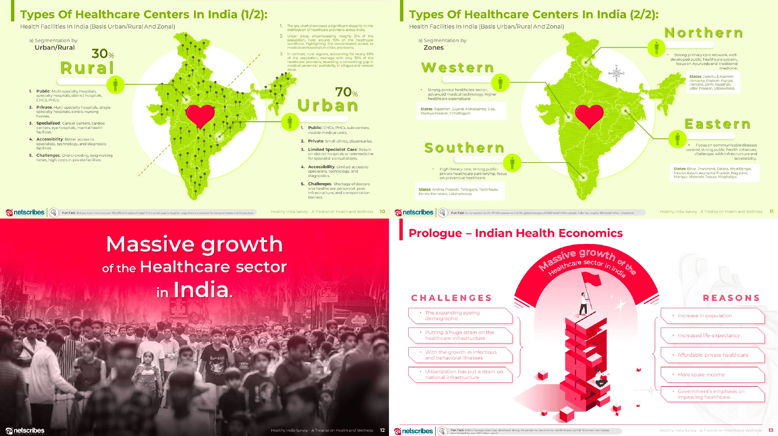 The final solution was a modern, insight-driven presentation of approximately 50 slides designed to make dense information intuitive and engaging. I used a neon pink and green color palette to reflect health, vitality, and wellness while giving the deck a contemporary edge. To maintain emotional gravity after the pandemic, all imagery was kept in black and white, allowing color to be used strategically as visual breaks and to highlight key statistics. Strong infographics formed the backbone of the design, helping viewers quickly grasp patterns, trends, and contrasts. Around 90% of the deck was designed directly in PowerPoint for speed and precision, with Illustrator used for custom iconography and visual refinement. The outcome was a clear, visually cohesive, and business-ready report that enabled Bajaj Allianz to identify post-pandemic opportunities and market new health products effectively. The project was recognized internally with a Spot Award at Netscribes for design quality, collaboration, accuracy, and turnaround time.